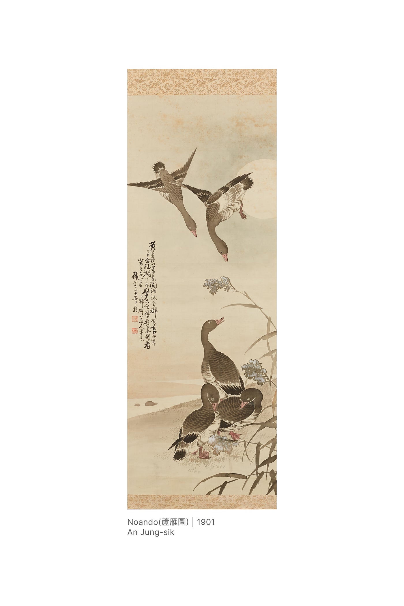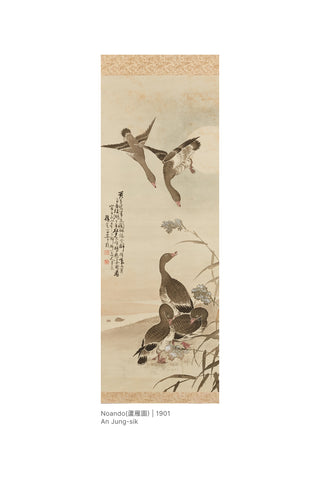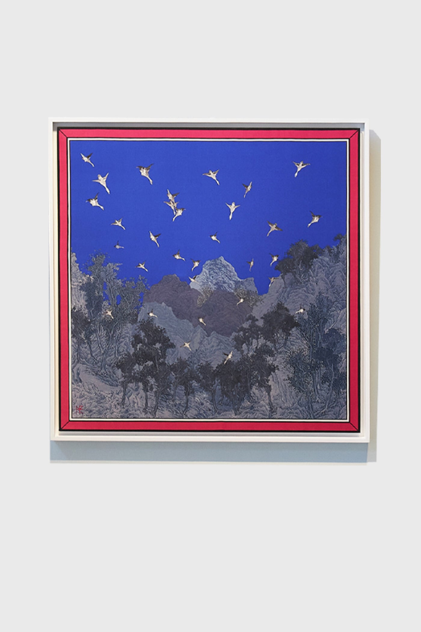 Inspired by Shim Jeon and Ahn Jung-sik’s distinctive blue-and-green landscape painting style, this framed scarf reinterprets geese in various formations into a single composition.