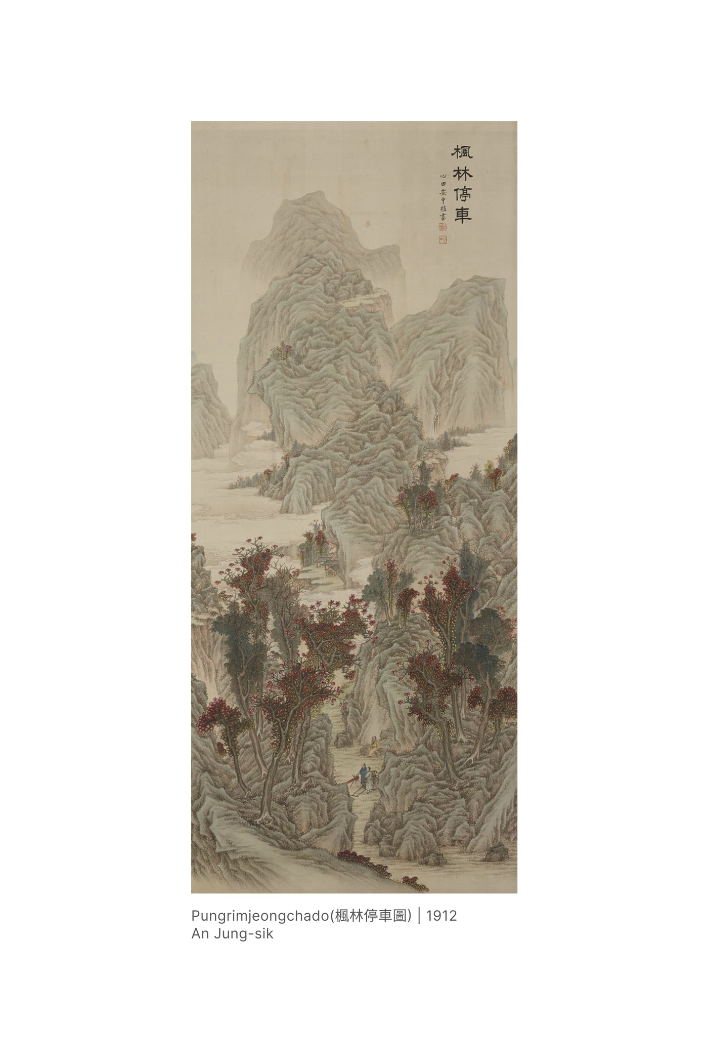 This work by Ahn Jung-sik illustrates a mountain journey poem by the Tang dynasty poet Du Mu and forms a pair with Dowonmunjindo. The piece highlights meticulous blue-and-green landscape techniques, characterized by sharply defined mountain peaks, exaggerated overlapping mountain ranges, and highly decorative coloring.